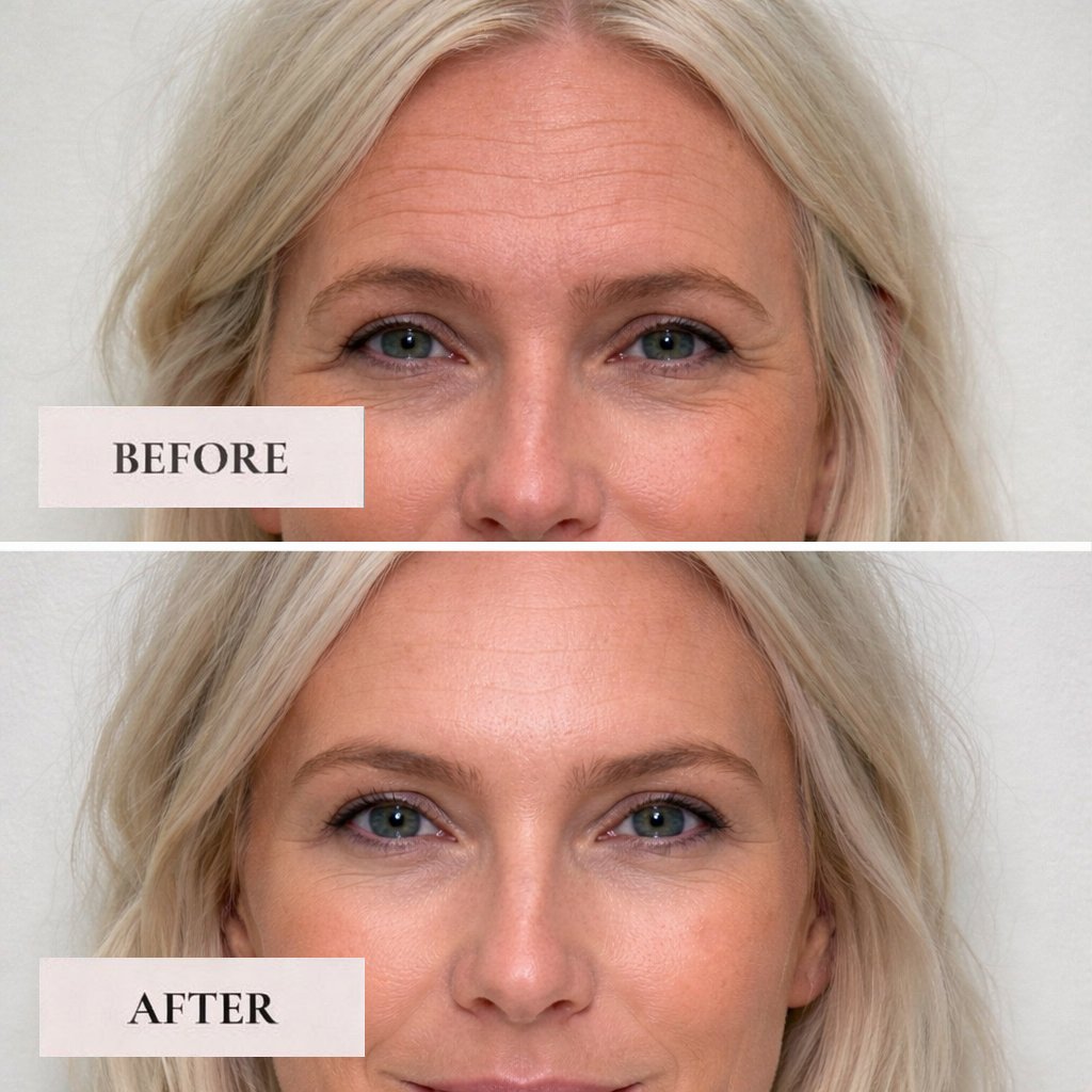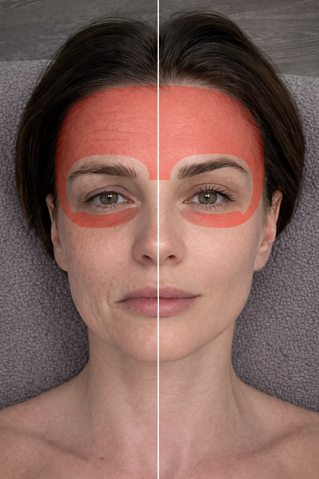 Facial transformation always begins with working on the upper third — the head, forehead, temples, and the orbicularis oculi muscle.